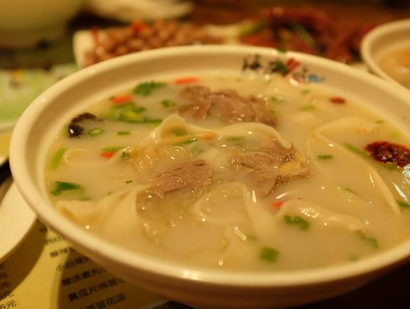 烩面是咱们河南地道的名片之一,是河南美食的经典之作。一碗成功的烩面,要用羊肉和羊骨熬汤,先用大火猛滚再用小火煲,煲出来的汤白白亮亮,犹如牛乳一样。面条柔韧劲道,加上海带丝、豆腐丝、粉条、香菜等辅菜,汤鲜味美,面弹劲足。