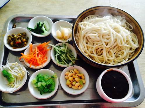 说到炸酱面,有这么一则民间段子:京味炸酱面,起源清末年,皇室落难期,百姓受饥寒,宫廷摆阔气,吃面配八盘,黄酱六必居,酱香色味鲜,瘦肉是精髓,秘制手擀面,高厨细烹调,酱香面筋软,每碗八碟菜,老少皆宜餐!