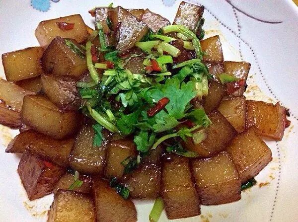 陕西油炒粉顾名思义将凉粉炒制而成,在平底锅内将猪油烧热,将切好的凉粉放入锅内,加入葱花和调料不停翻搅,直至金黄滚烫,越烫越好吃。