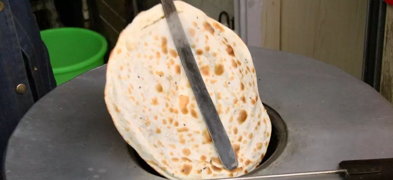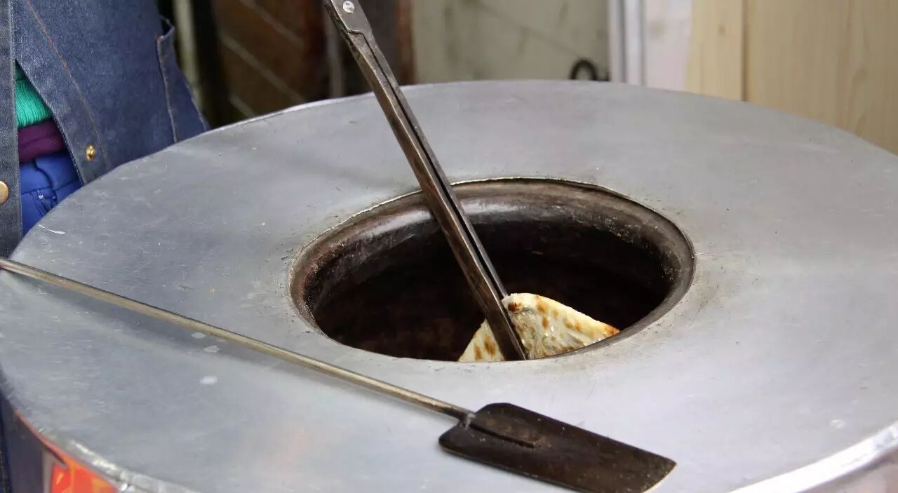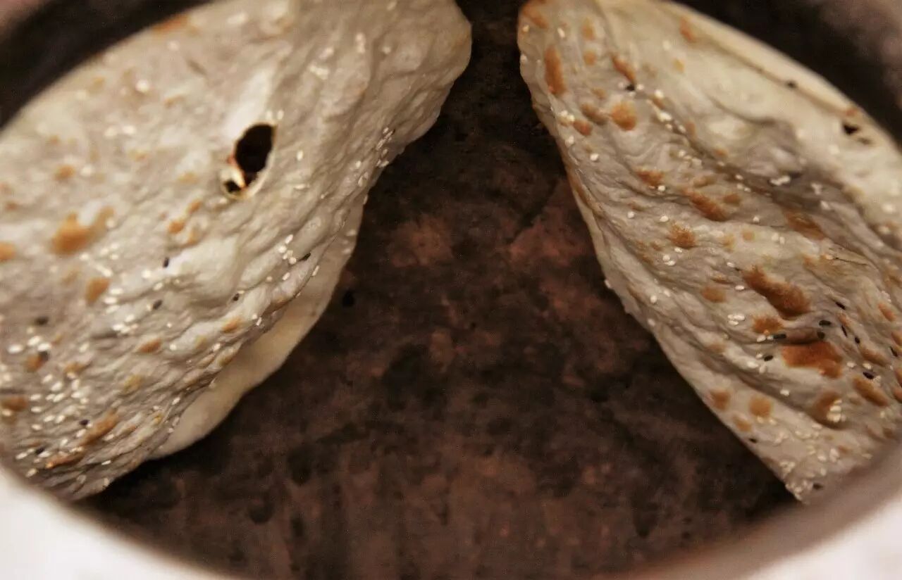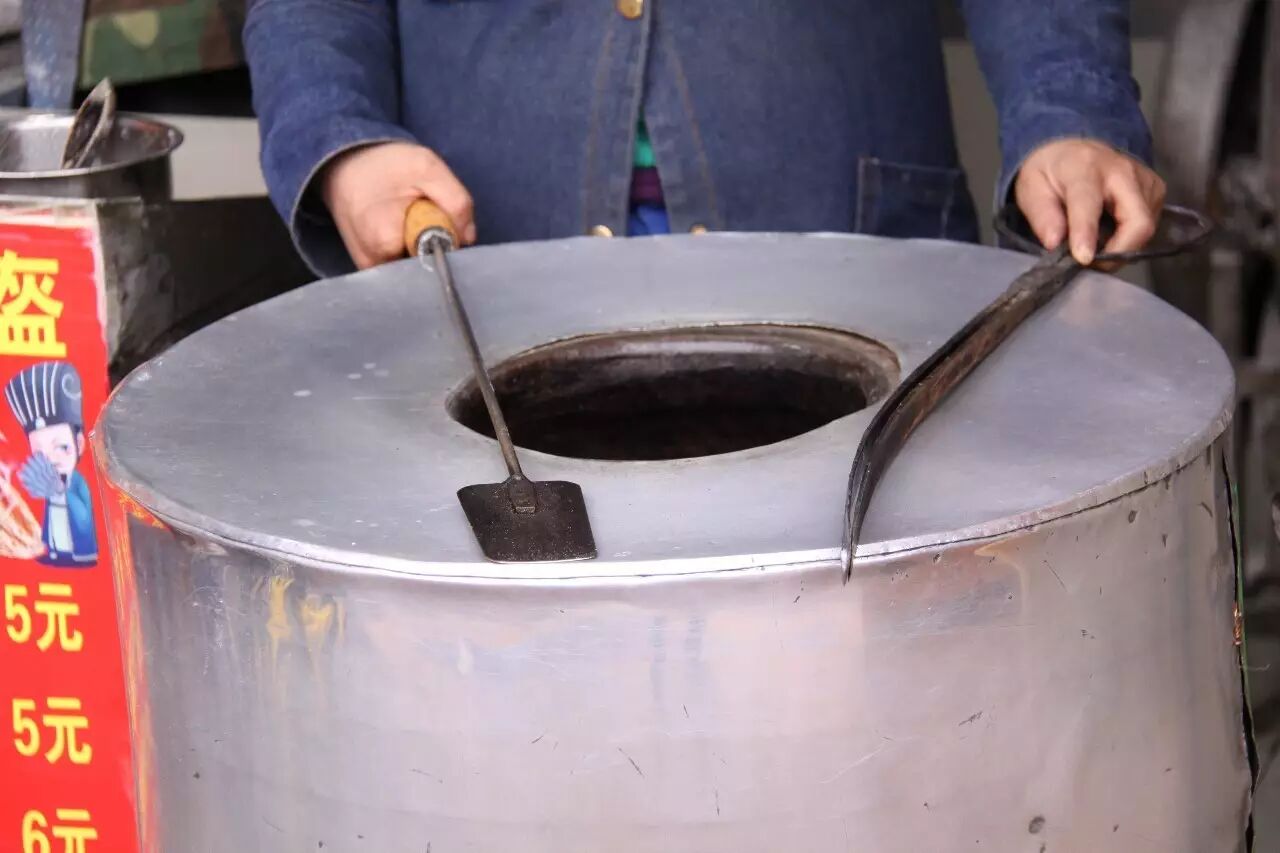 锅盔是用陶罐烤出来的,用火把炉壁烧热,再把饼贴在炉壁上,薄薄的饼一边烤热后,另一边也差不多了。用陶罐烤一次可以做六个,每次都是边做边烤,所以给顾客的都是刚烤好的热腾腾的锅盔。
