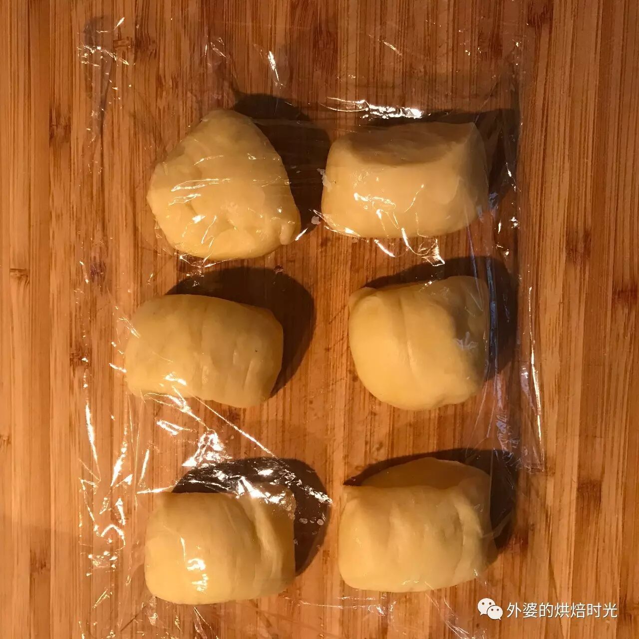 step 5:发好面团完全排气,分割成约40g一个的小面团(约12个),搓圆,覆盖保鲜膜松弛10分钟。