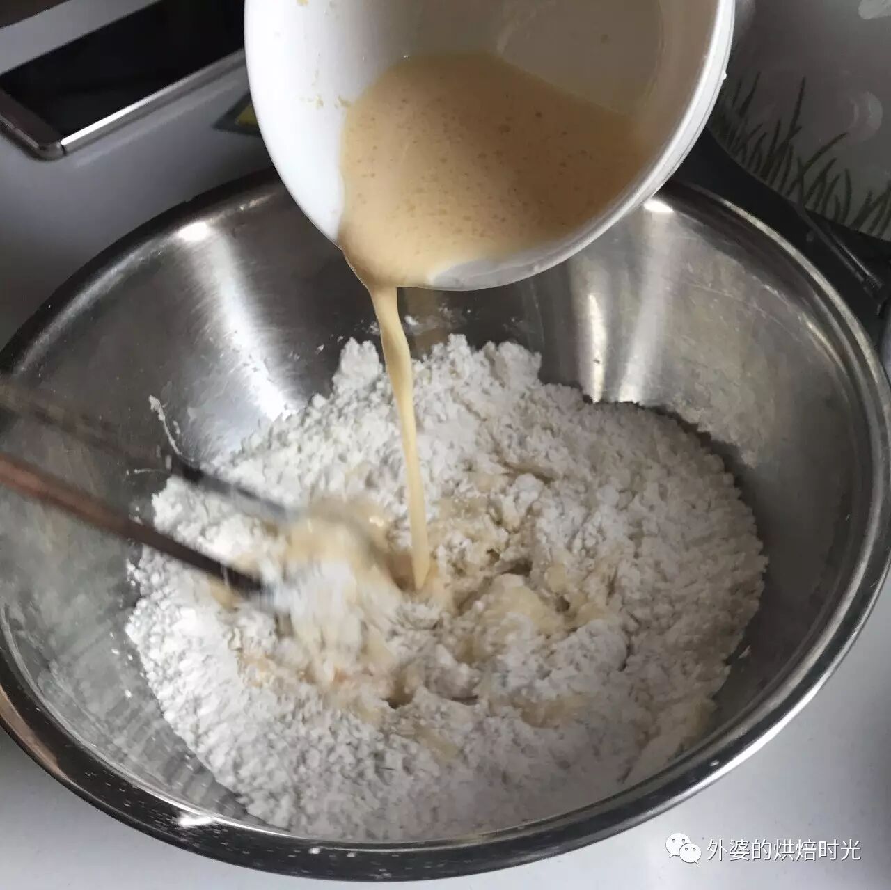 step 2:分次加入面粉中,边倒边搅拌。