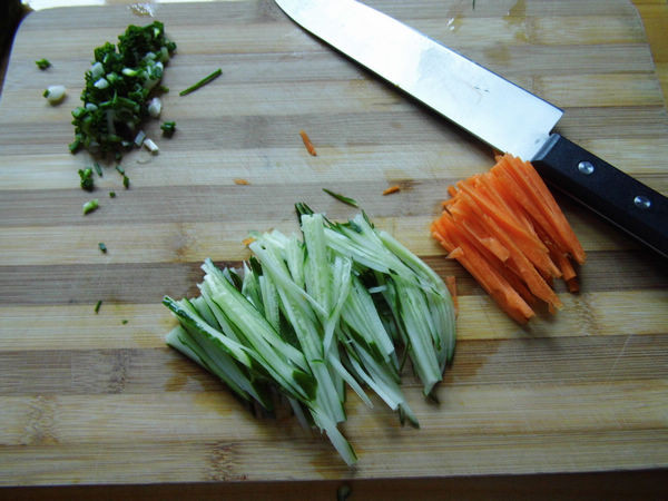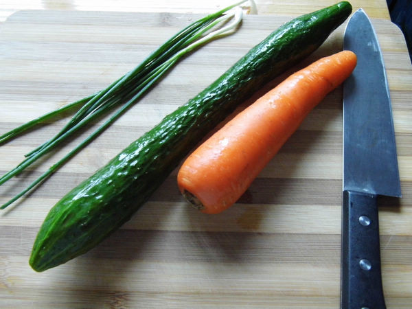 准备配菜,黄瓜、胡萝卜、细香葱、蒜