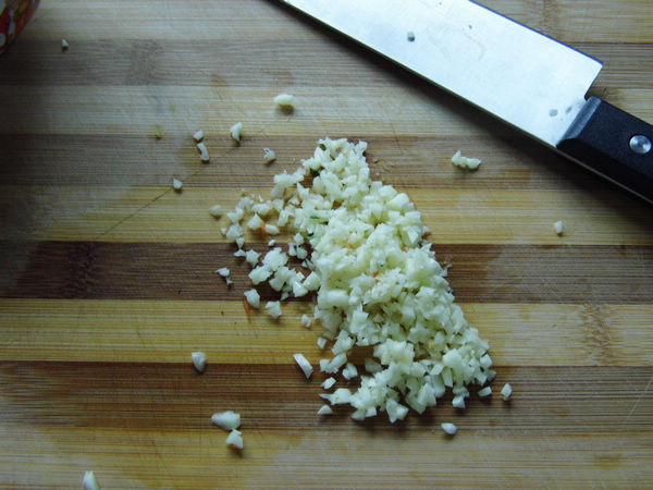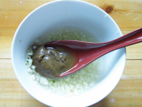 准备蒜水,蒜切末,倒入凉开水,再加入少许食盐,这样吃凉皮就不用放盐了,在舀1勺的芝麻酱调均