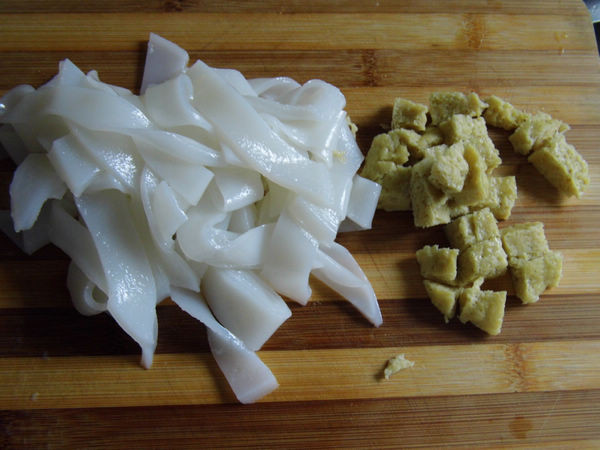 面皮叠放在一起,切成自己喜欢的形状,面筋切成小块