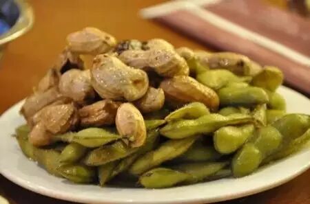 花毛一体即:花生米、煮毛豆拼一盘。
