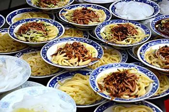 陕西面食无论花样、质量都是杠杠的。但任你是biangbiang面、裤带面、刀削面、棍棍面、油泼面,面馆都会提供一种吃法,即“三合一”。