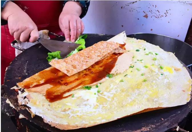 杂粮煎饼是一种小吃形式的煎饼,主要特色:香,里外全脆,味美,酱主要以回味感为主。