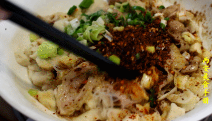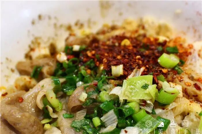 春发芽的小炒里放的不是牛羊肉,取而代之的是精肠,馍和肠下锅炒好后码在碗里,然后和吃油泼面一样,在顶头泼上香辣的油泼辣子,隔老远都能闻到一股油香辣子味儿。