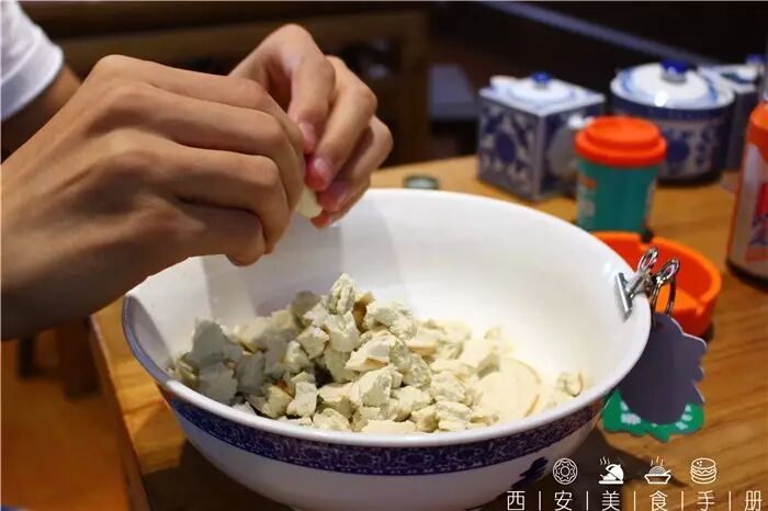 春发芽的馍半发面八分熟,如此更具嚼劲。一碗泡馍配两个饼,自己掰好,不够可以续加。葫芦头里的掰馍和平日里坊上的牛羊肉泡馍略有不同,馍太大会夹生,太小也会没有口感,最好和拇指盖一样大小就算掰的到位了。