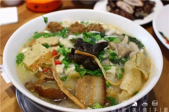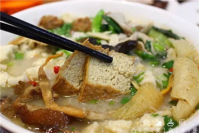 泖好的炸丸子绝对是爱吃君的最爱,内里有汤香,外面有油香,爱吃君忍不住又单泖了一份炸丸子加进去。五花肉处理过后,肥肉瘦肉层次鲜明,吃起来肥而不腻,再加上经过底汤一泖,更是多了一份鲜香。猪皮和豆干多浸一会汤,吃起来会更香,而一边扒着泡馍,一边吸着白汤,一碗三鲜泡馍,吃的就是个舒坦!