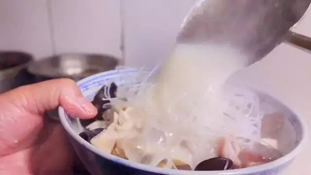 铺上肉片、木耳和粉丝,