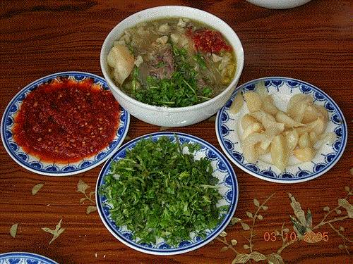 鲜羊肉或牛肉、八角、桂皮、茴香、花椒、大料、桂皮、冰糖、面粉、盐、木耳、粉丝、葱段、葱花,姜块,香菜末、胡椒面、鸡精(或者味素)。