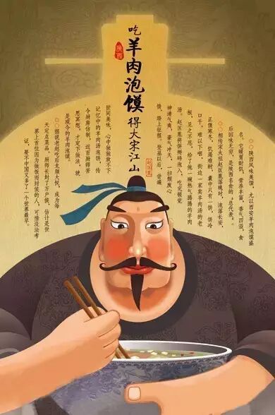 十年后,赵匡胤当了北宋的开国皇帝,一次出巡长安,路经当年那家羊肉铺香气四溢,不禁想起十年前吃羊肉汤泡馍的情景,便令停车,命店主做一碗羊肉汤泡馍。