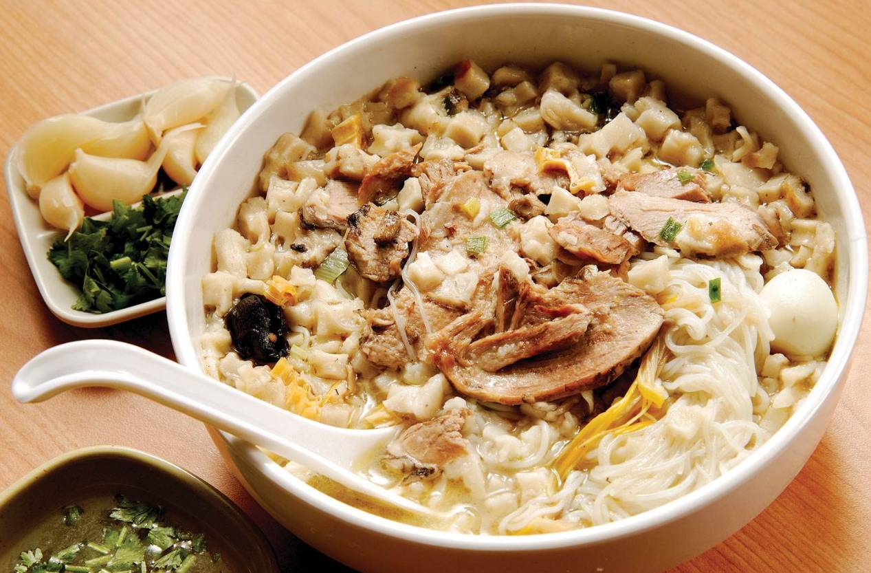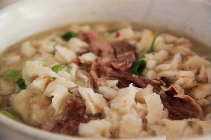 (2)制作流程先将烙饼掰成碎块;黄花、木耳洗净撕碎;粉丝泡发;青蒜洗净择段;香菜择洗净;卤羊肉切片备用;将掰好的烙饼放到锅里,加入羊肉汤,放入黄花、木耳、粉丝、青蒜,煮熟;调入盐、味精、胡椒粉拌匀,盛入碗内;放上切成片的卤羊肉,撒上香菜即可。