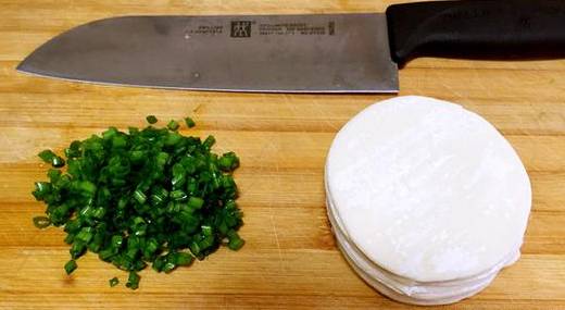3、然后盖上一张饺子皮重复刷油,撒食盐和香葱。