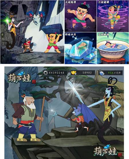 一般会选取动画片中的一些经典场景和打斗画面。比如在如下的广告素材中,使用了原作动画片葫芦娃以及蛇精的打斗画面,该场景和画面都是原作中为人熟知的画面,亦能勾起玩家的回忆。