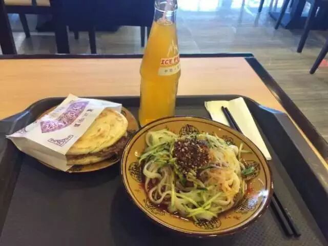 优雅的说法:我今天中午吃的有特调微辣蒜汁焗冰鲜蒸白玉粉和香嫰乳猪肉浇汁配麦香Q脆饼!另配一瓶西安土产香橙味碳酸汽水饮料“ice peak” !