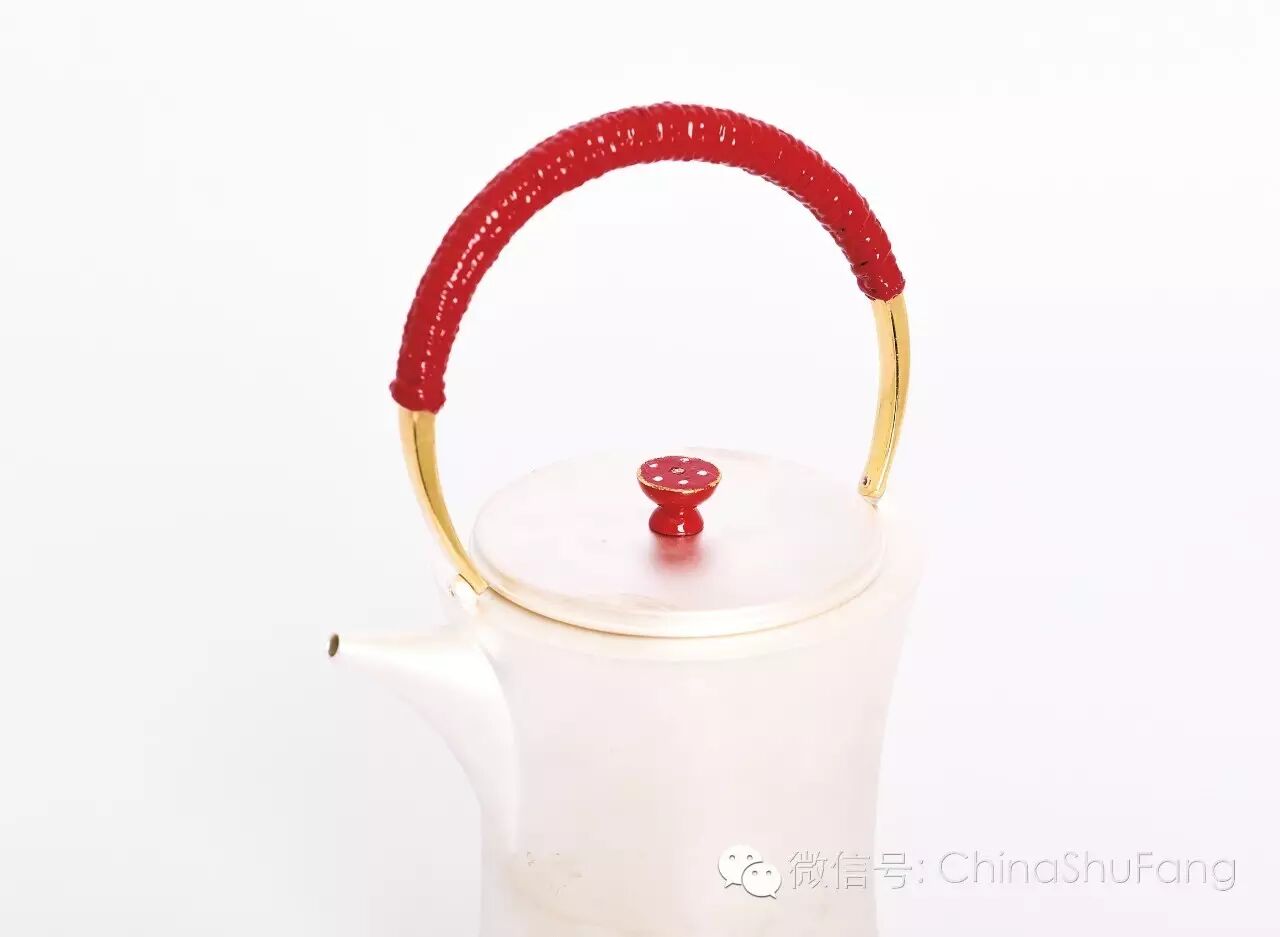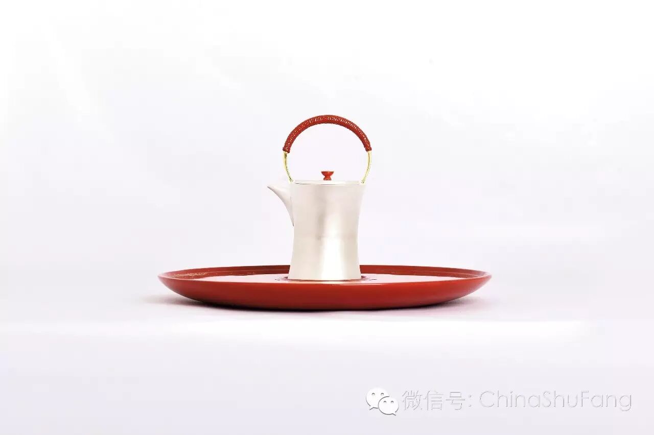 银壶用高壶以示庄重,提手下为圆形,寓意圆满。壶盖手工雕刻指印图案,在壶盖的钮部分用大漆制作而成,为简化的莲蓬造型,象征着多子多福。