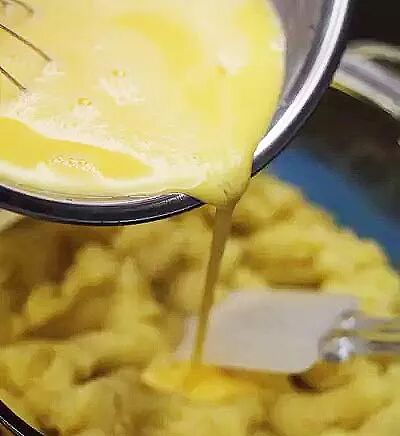 4.等锅内的面团冷却至不烫手时,加入打散的三个鸡蛋,先加三分之一,搅拌混合均匀后,再加三分之一,搅拌混合均匀。最后的三分之一要慢慢加,边加边看面糊的状态。