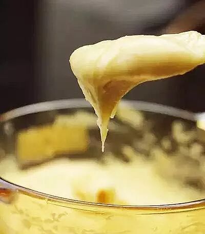 5.当把面糊挑起能呈现如图的这种倒三角时,就不用加鸡蛋了,所以鸡蛋不一定要全部加完,看面糊状态而定。