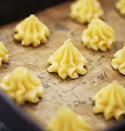 6.把面糊装入裱花袋中,剪个口子直接在垫有油纸的烤盘上,如果想造型好看,就用大号的菊花型裱花嘴挤,尽量挤得大小相同。