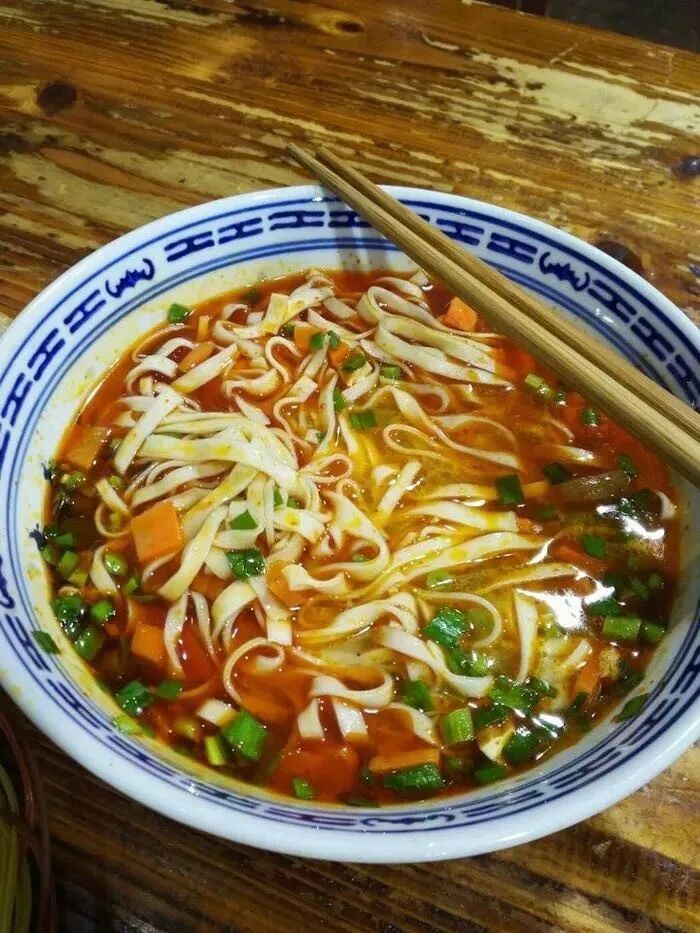 各色蔬菜下锅,油泼辣子给足,原汤化原食的面汤都是清清亮亮。滚烫的热油,淋在面皮上,刺啦啦的声响让人不住地想咽口水。