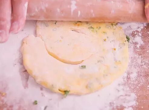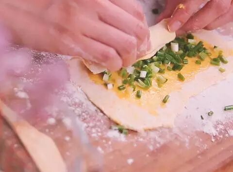 擀成面饼状之后就在上面加芝麻油、盐和葱花,然后把它卷起来