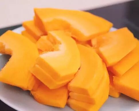 切好之后装盘用高火隔水把南瓜蒸大概8分钟。