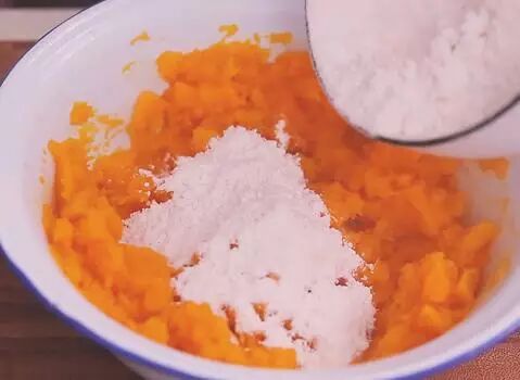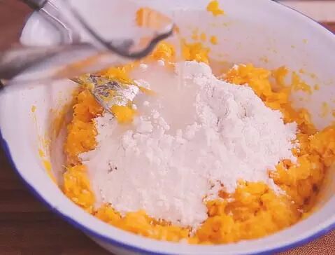 混合到一半之后呢再加剩下的面粉,加清水。(南瓜跟面粉的比例大概在2:3左右)