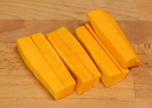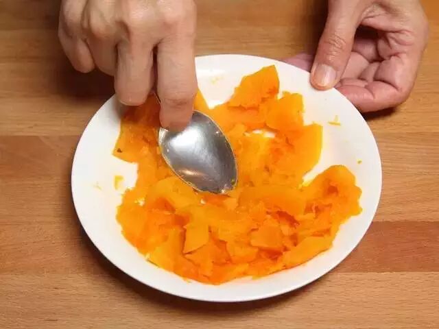 2. 南瓜切块。隔水蒸8分钟直至变软,再压成泥。