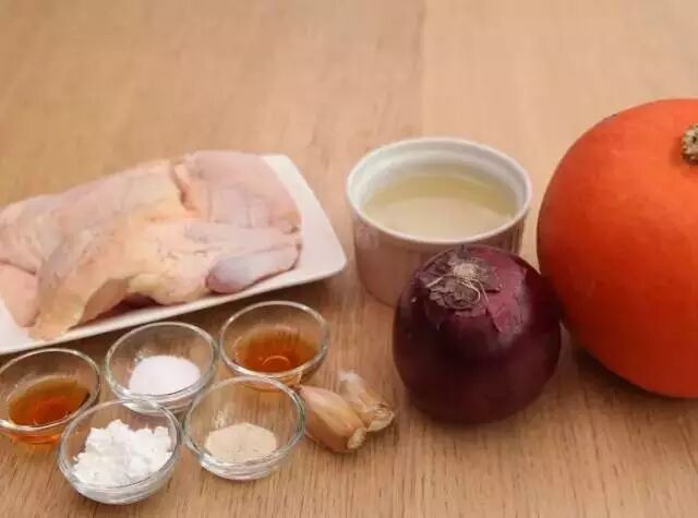 南瓜、鸡肉、洋葱、蒜、盐、油、麻油、酱油