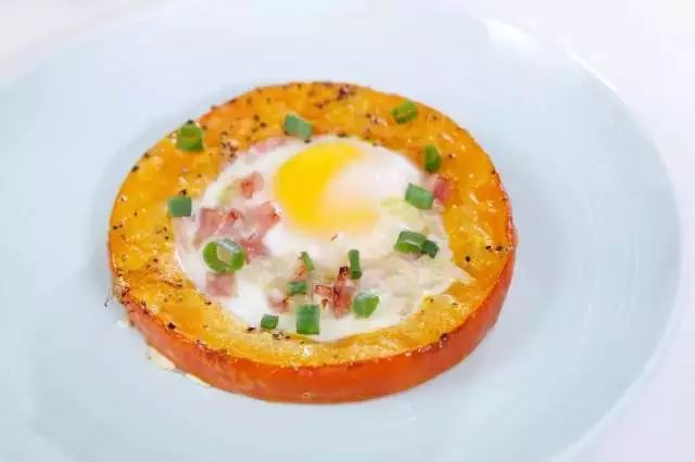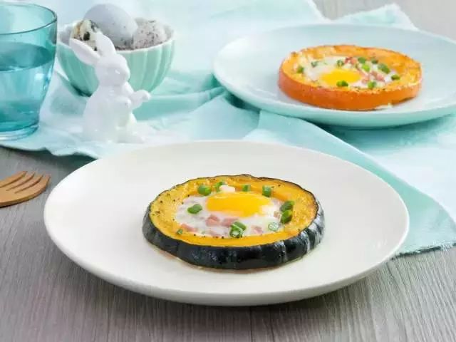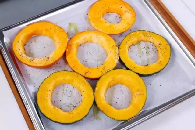 5. 取出烤盘,在南瓜圈上,打入鸡蛋,洒上火腿和洋葱,加盐和胡椒调味。再放入烤箱中烤10分钟。