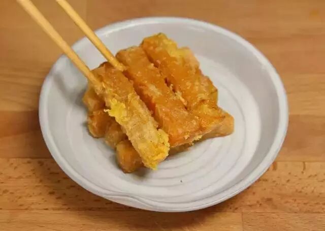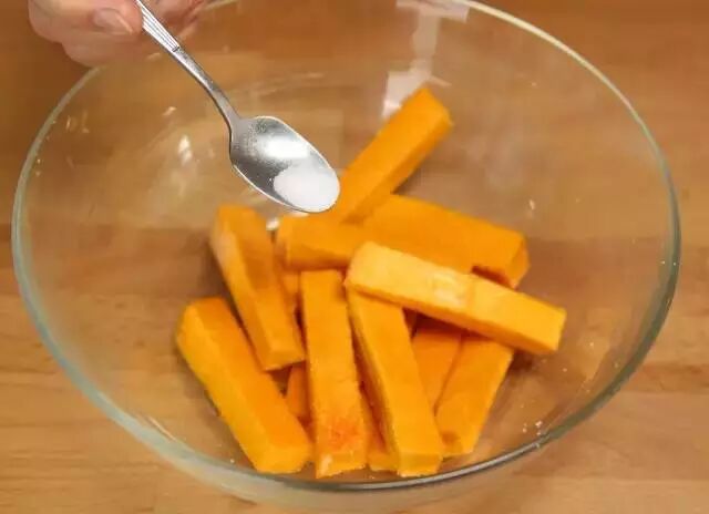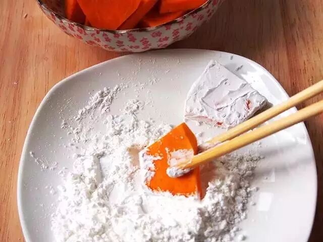 3. 热锅入油,放入南瓜油炸,炸熟后捞起备用。