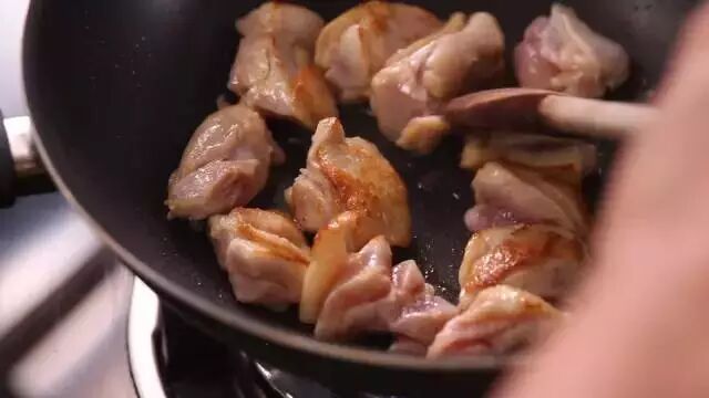 4. 热锅入油,加入蒜和洋葱爆炒,再加入鸡肉,炒至金黄后起锅备用。