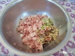 4猪肉加芝麻油、盐、酱油、胡椒粉、白糖、味精、葱姜顺一个方向搅拌上劲。