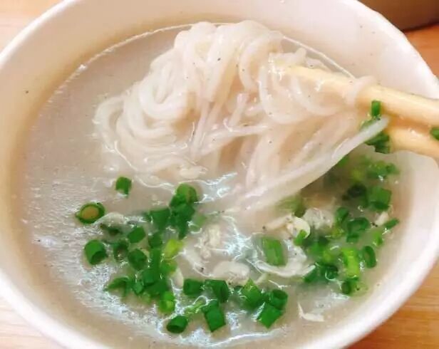 外貌特征:糊汤微稠、米粉洁白、细长有劲。