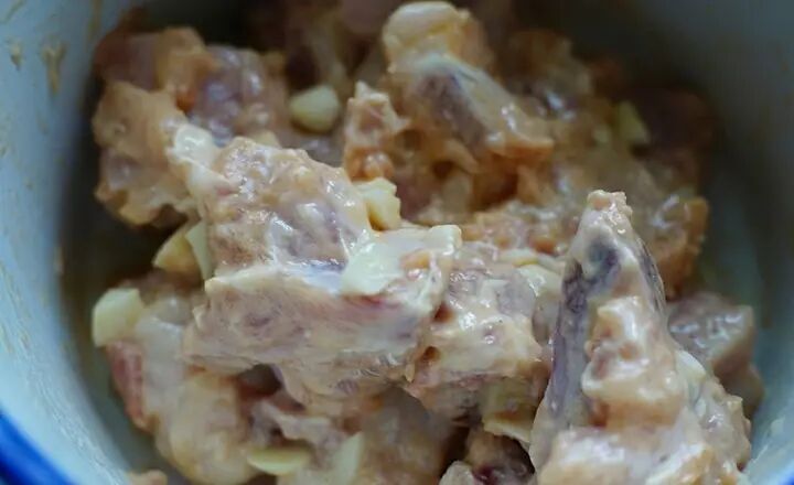 3. 抓捏好加入盐,白糖一丁点(提鲜),蒜,生抽,老抽,料酒,白胡椒粉,五香粉,少许油,再抓捏均匀腌制25分钟