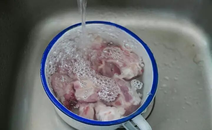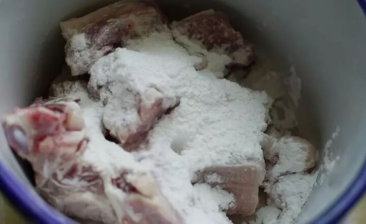 2. 冲水后捞起沥干,加入生粉,生粉的量要能完全裹满排骨,用手抓捏让生粉更容易融入排骨,排骨嫩不嫩就在这一步哦