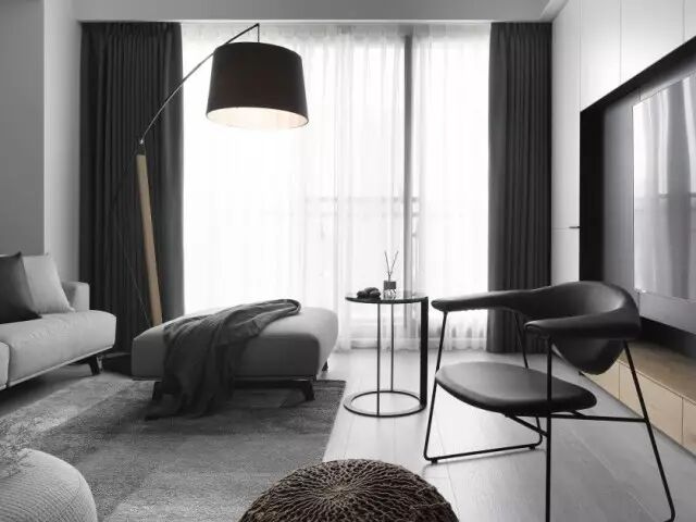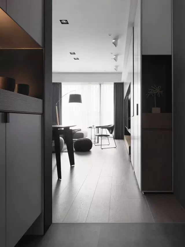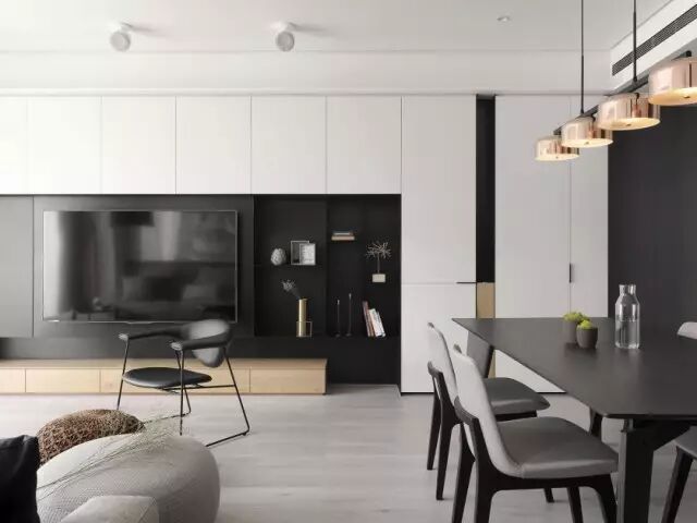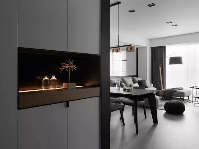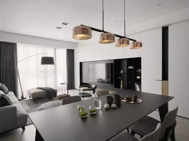 灰色餐椅与玄黑的桌面衬托下更加细腻柔和,连同客厅的灰色调性也温暖起来。