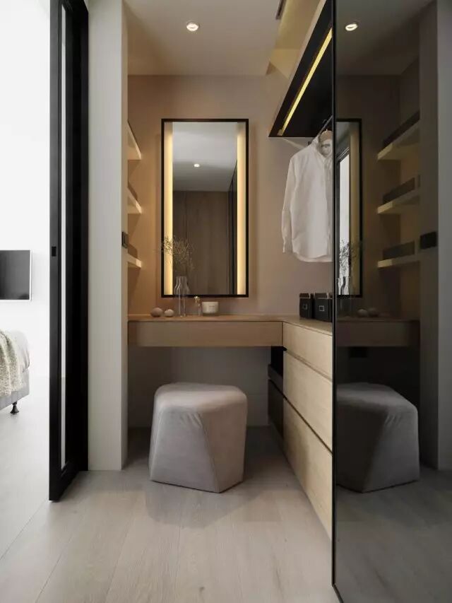 玄关嵌入式收纳柜,台面感应灯光设计精致暧昧,星星点点让回家的人感到温暖安心。