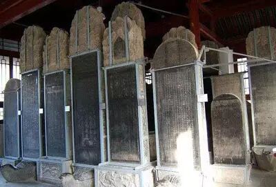 陕西省西安市南城墙魁星楼下的碑林,因碑石丛立如林而得名。这是收藏中国古代碑石时间最早名碑最多的汉族文化艺术宝库。它始建于北宋哲宗元佑二年(1087年),原为保存唐开元年间镌刻的《十三经》、《石台孝经》而建,后经历代收集,规模逐渐扩大,清始称"碑林"。几经易名,1992年正式定名为西安碑林博物馆。该馆是在西安孔庙旧址上扩建而成的一座以收藏、研究和陈列历代碑石、墓志及石刻造像为主的艺术博物馆。从西安钟楼南行,将至南门往东拐,便是书院门古文化街,街口有一座古韵十足的高大牌楼,牌楼上方是"书院门"三个金色颜体大字,两旁是"碑林藏国宝,书院育人杰"的醒目对联,街道两旁是青一色仿古建筑,街道为青石铺砌。这里能体会到西安不同于别处的城市风景。