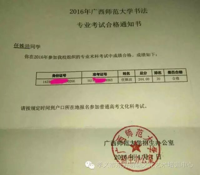 任姝洁:孝义三中学生,在东方明珠教育高考书法班学习,参加2016年的书法高考专业考试,以全国第20名的优异成绩取得了广西师范大学的校考合格证。