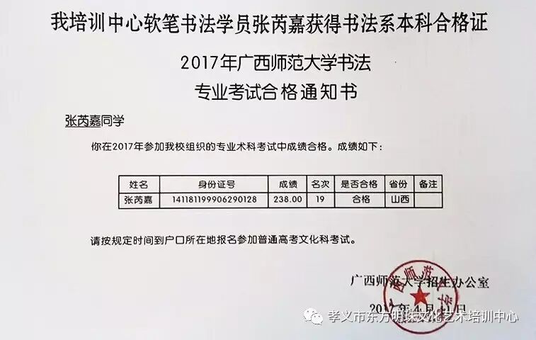 张芮嘉:孝义三中学生,在东方明珠教育高考书法班学习,参加2017年的书法高考专业考试,以全国第19名的优异成绩取得了广西师范大学的校考合格证。