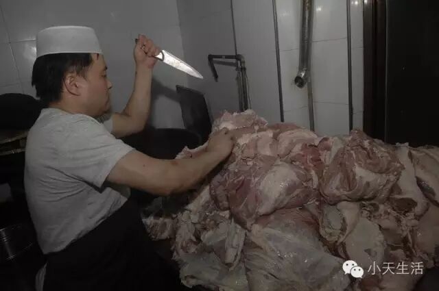 这堆一百多斤的羊肉是这口锅里的用量,同样也是泡过冷水的,可以看出来基本上都是腿肉。