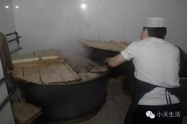 掀开小火闷炖了十个小时的大锅锅盖,把下面的木板按照铺上去的顺序反向逐个拿下来,放在一边待用。