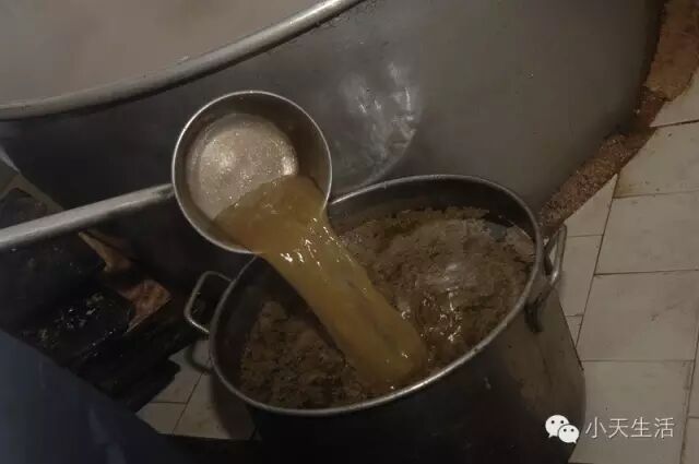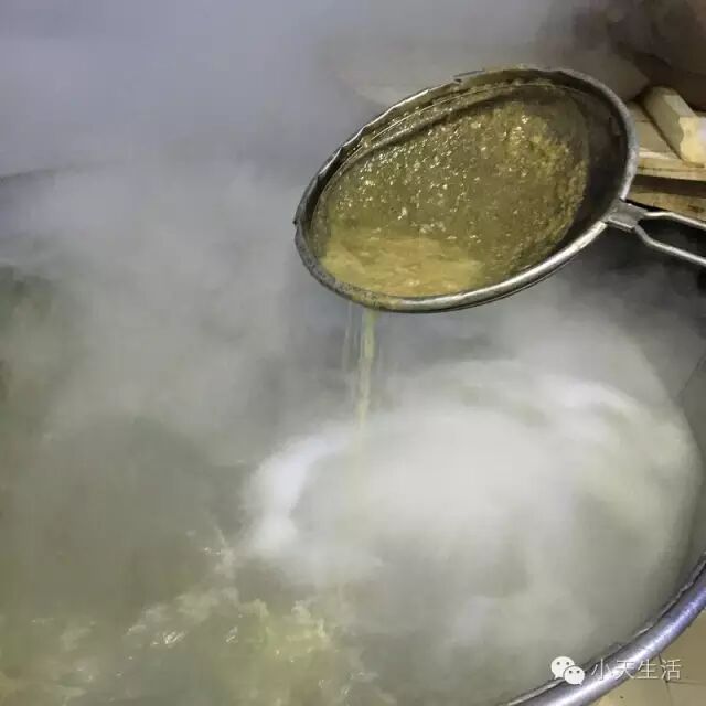 先将锅中的肉汤用桶舀出来一部分稍后备用。