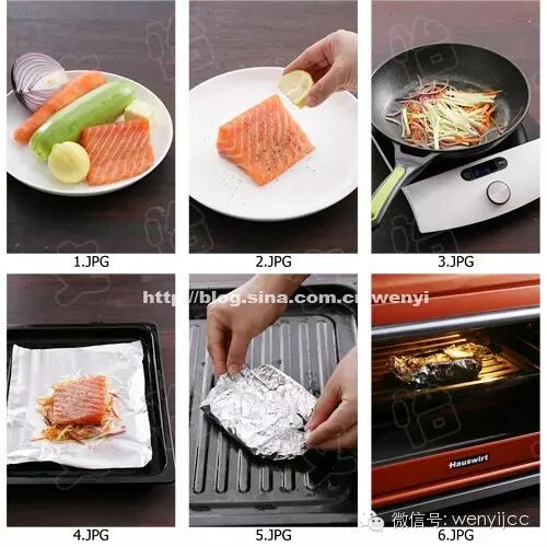 4)锡纸上抹些植物油,先铺上一层蔬菜丝,再把腌好的三文鱼放在蔬菜丝上面,将锡纸折叠盖好,四周封死,放入烤盘,将烤盘放在烤箱的中层,180度烤15分钟左右即可。