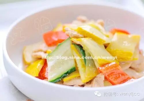 3)锅烧热,倒入油,放入大蒜片爆香后,放入鸡肉片快速炒散,待鸡肉变色后,放入西葫芦片炒半分后,然后放入黄瓜片和红椒片,撒入盐和糖搅匀即可出锅。