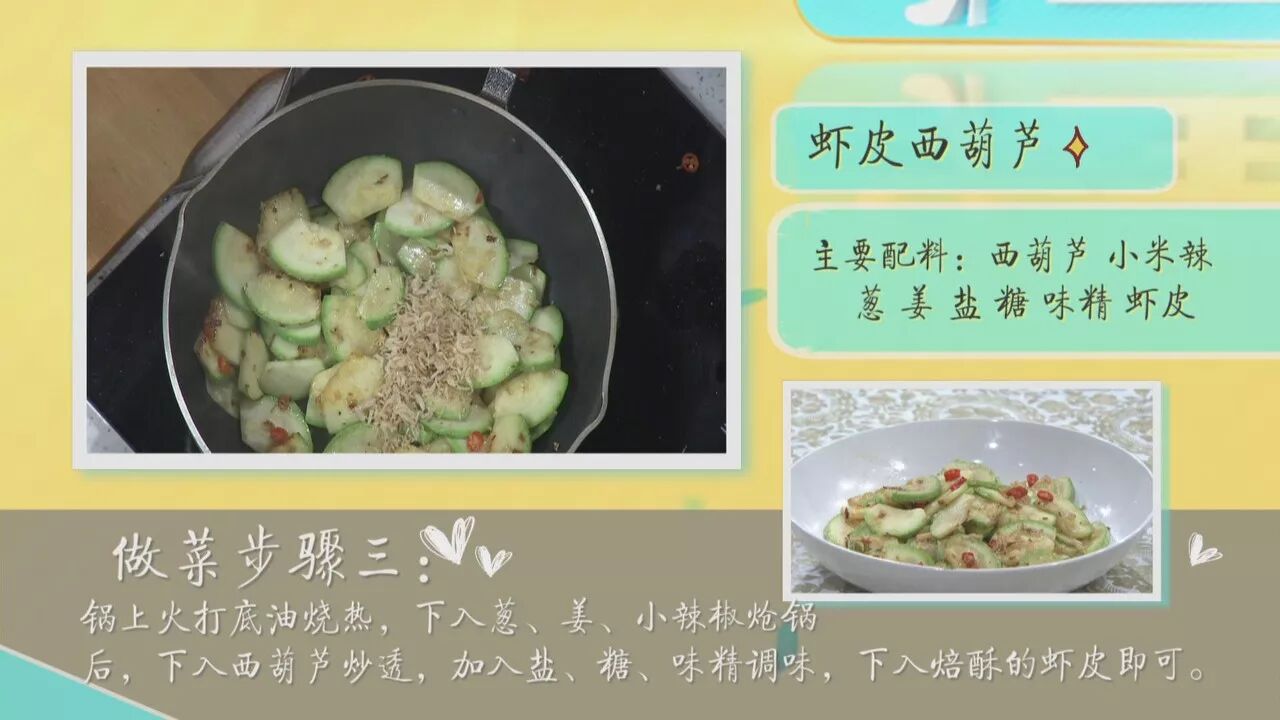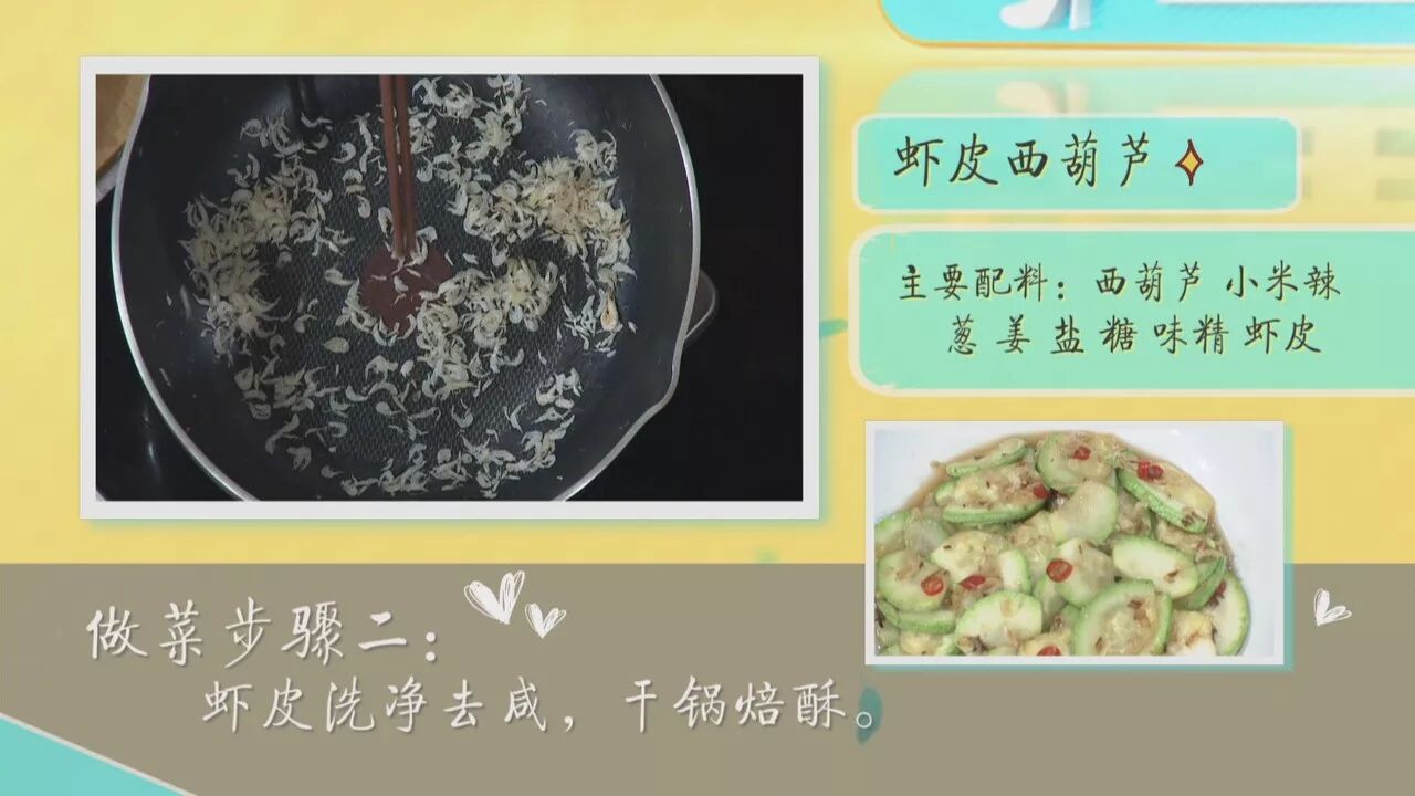 步骤三:锅上火打底油烧热,下入葱、姜、小辣椒炝锅后,下入西葫芦炒透,加入盐、糖、味精调味,下入焙酥的虾皮即可。